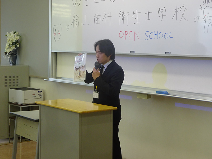 「校内見学」では館内を廻り、診療室の説明を行いました。「グループになり技術を磨き、沢山の実習を行う場所です」